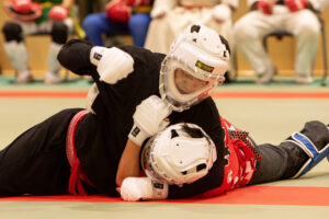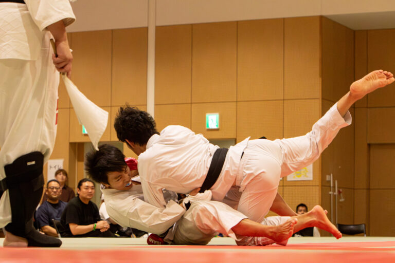 織田選手がタックルに入り、西村選手の道着を上手く掴んで場外に押出し、有効ポイントを奪取します。その後もハイキックやバックブローで有効打を狙う織田選手。