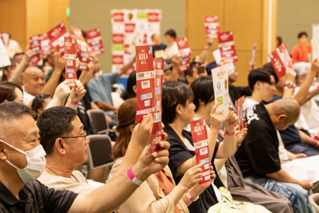 時間内に決着がつかなかった試合は、観客が主審となって紅白ボードで判定。会場が一体となって試合に参加していました。