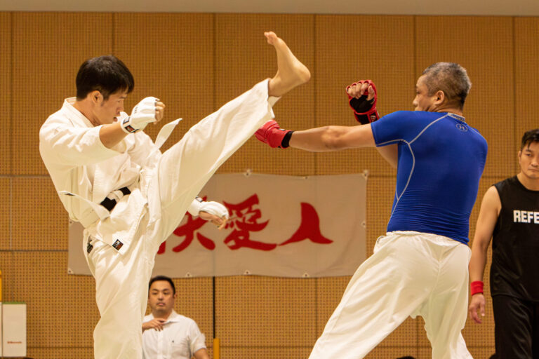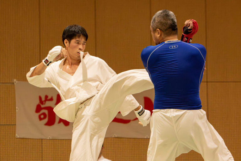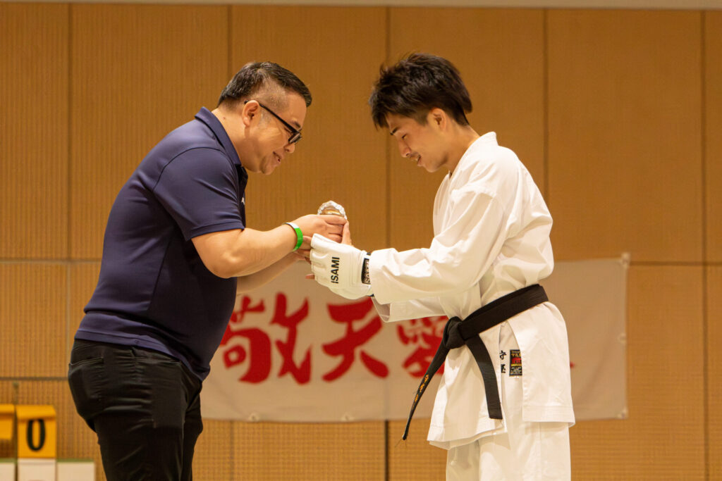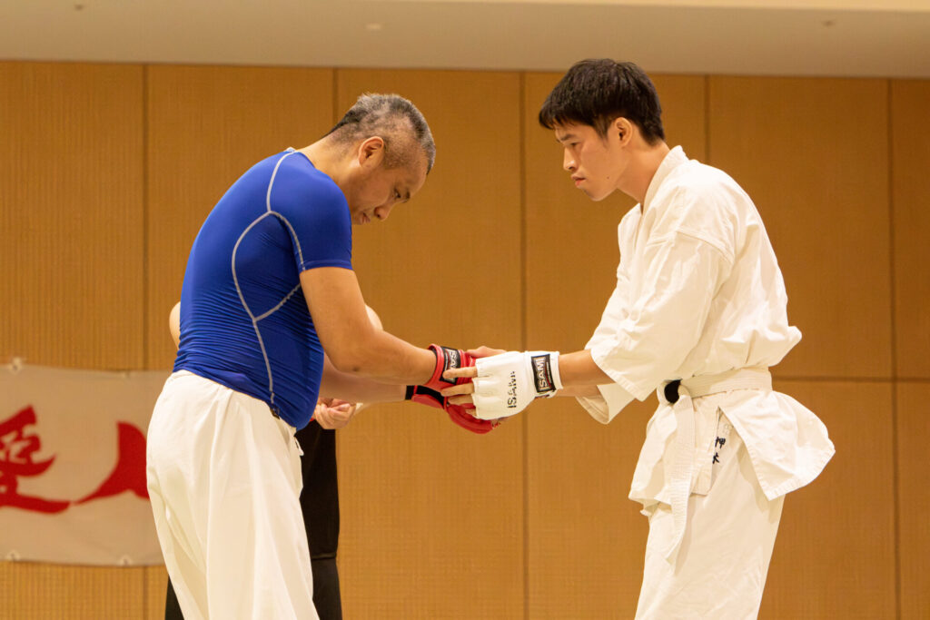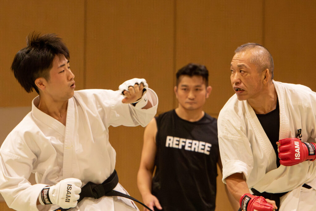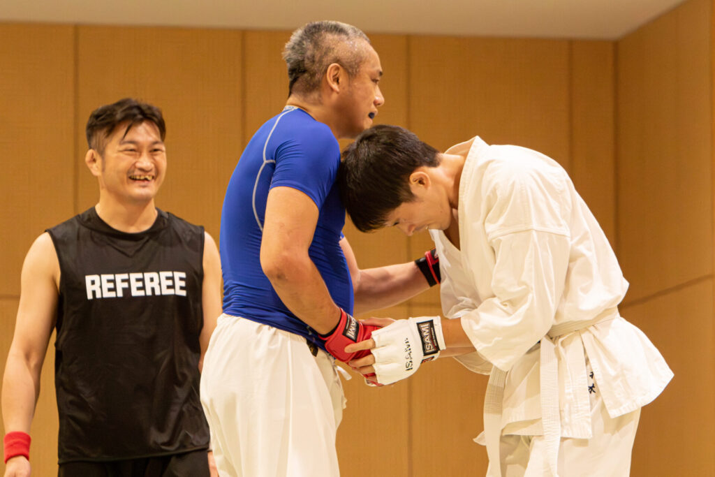 現代空手道研究会所属の森川選手は、敬天愛人の審判も務めてくださっている、55歳のベテランファイター。対する守屋選手は誰ツヨDOJOy所属の若手23歳。なんと32歳差の年の差対決となりました。