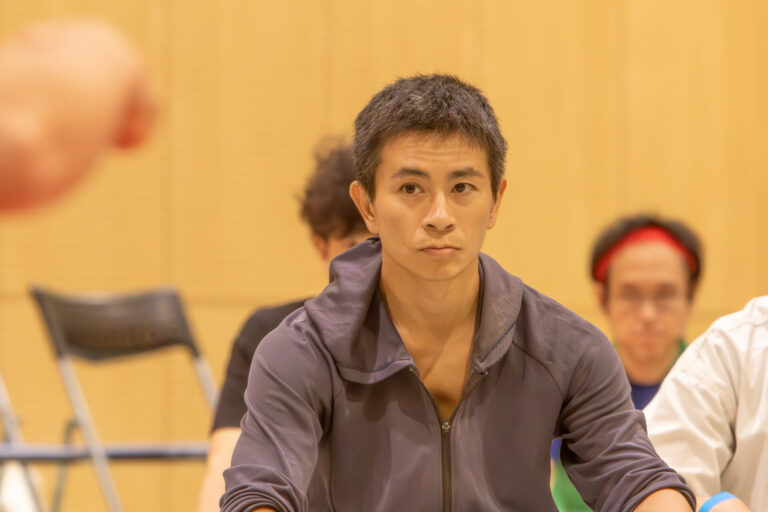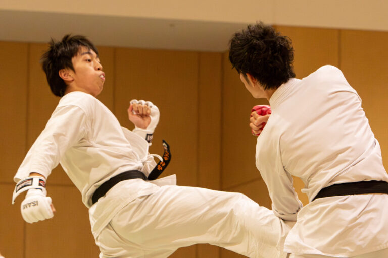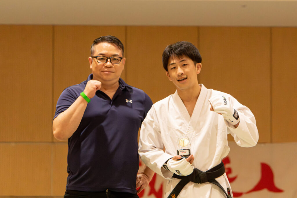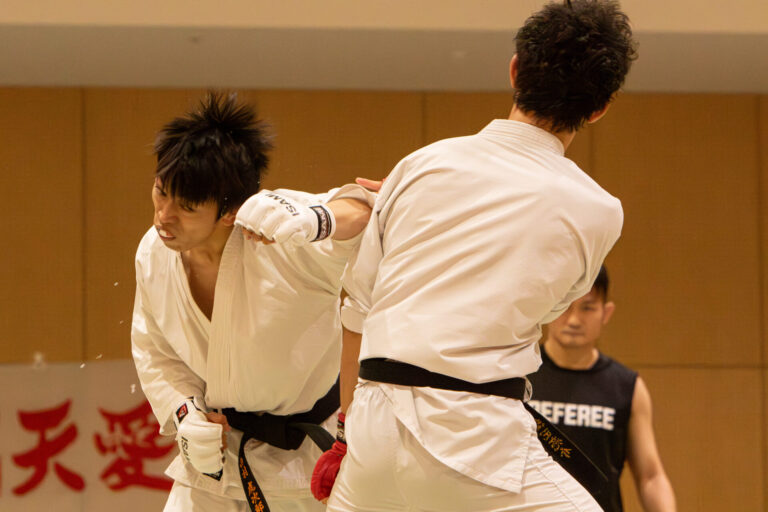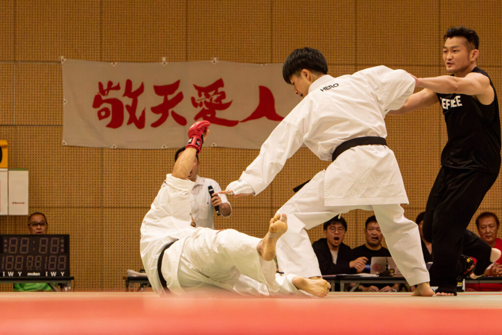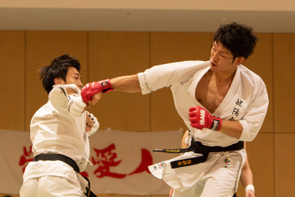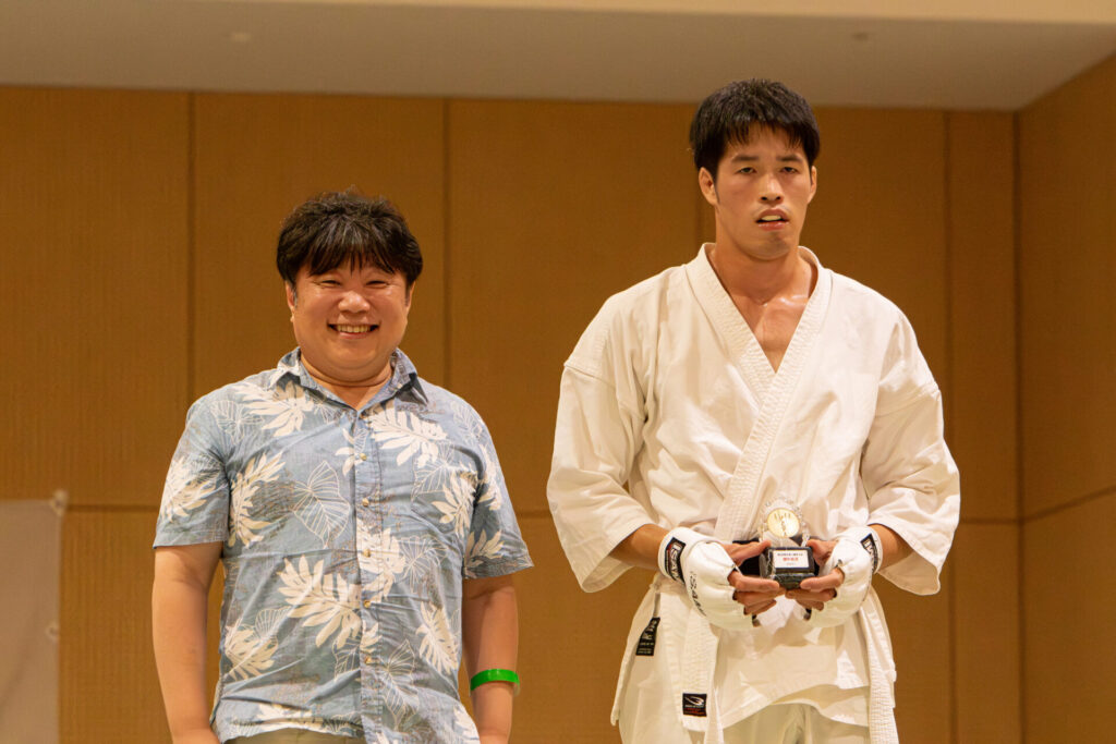 現代空手道研究会所属の森川選手は、敬天愛人の審判も務めてくださっている、55歳のベテランファイター。対する守屋選手は誰ツヨDOJOy所属の若手23歳。なんと32歳差の年の差対決となりました。