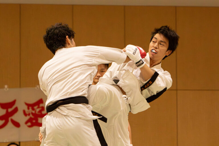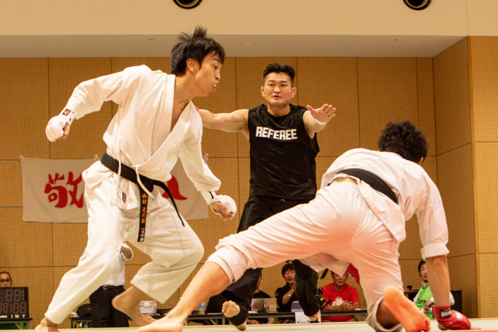 空道でも結果を残し、過去の敬天愛人練武大会では日本拳法の猛者に2連勝中の押木忍選手。対するは巌流島の全日本武術選手権トーナメントにも出場した、現代空手道研究会のKENGO選手。ともに180cm越えのヘビー級メインイベントとなりました。