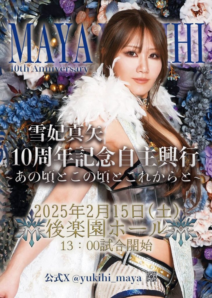 雪妃)私事ではございますが、今年の11月24日をもちましてデビュー10周年を迎えさせていただきます。つまり皆様とのお付き合いも十年目ということになりますが(笑)相変わらずお世話になっておりましてありがとうございます。10周年を迎えるにあたりこの度自身初の自主興行『雪妃真矢10周年記念自主興行~あの頃とこの頃とこれからと~』の開催をさせていただきます。日時は2025年2月15日土曜日の後楽園ホールにて13時開始の予定でおります。なんと会場の都合でデビュー月の11月に開催ができないという(苦笑)