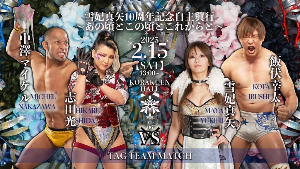 雪妃)私にとっては物凄く、もう前々からこれは決めていたカードで。昨年4月、5月とかには固まっていて。当初1月5日にこの大会をやる予定でいたんですけれど、それが一度バラシになり2月15日に変更させて頂いて。AEWに中澤さんから3選手の許可をとっていただいて発表待っている段階で私が怪我をしたという形になりました。参戦発表さえできないままこのカード自体幻になって、私も試合をせず全7試合で行うかっていうふうになっていたんですけれども、3選手とも『ギリギリまで待つよ』と今日まで発表待っていただいておりました。自分の経過が良好なのもあって、このカードをこの大会のメインイベントとしてやらせていただくことにします。