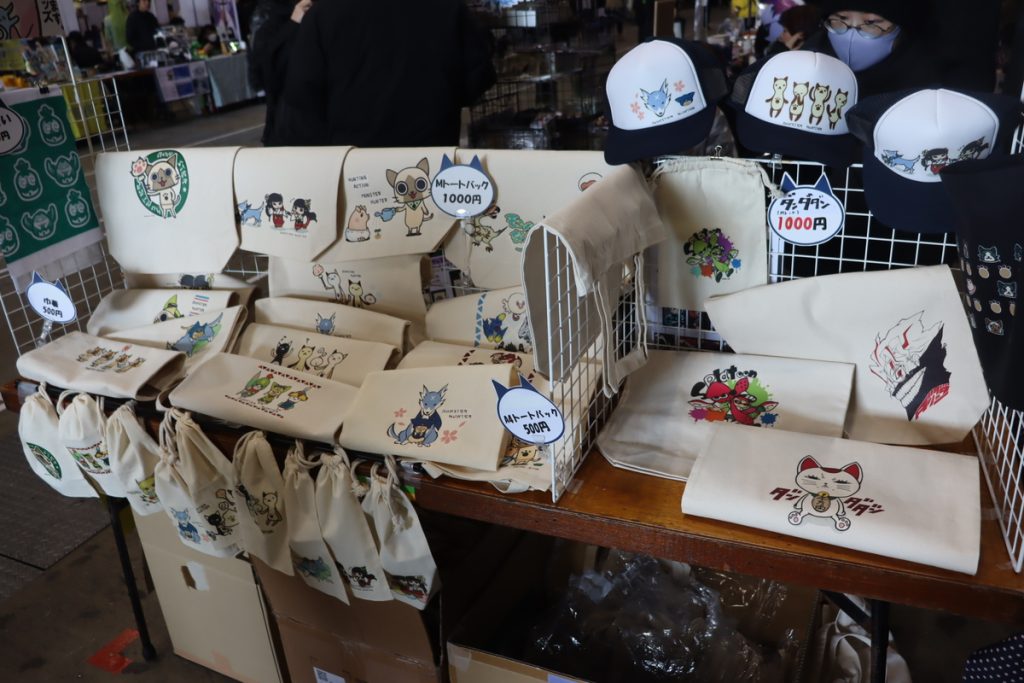 「モンスターハンター」や「ダンダダン」といった人気作品を題材とした、トートバッグを頒布するサークルも。頒布されるアイテムは、多岐にわたる。