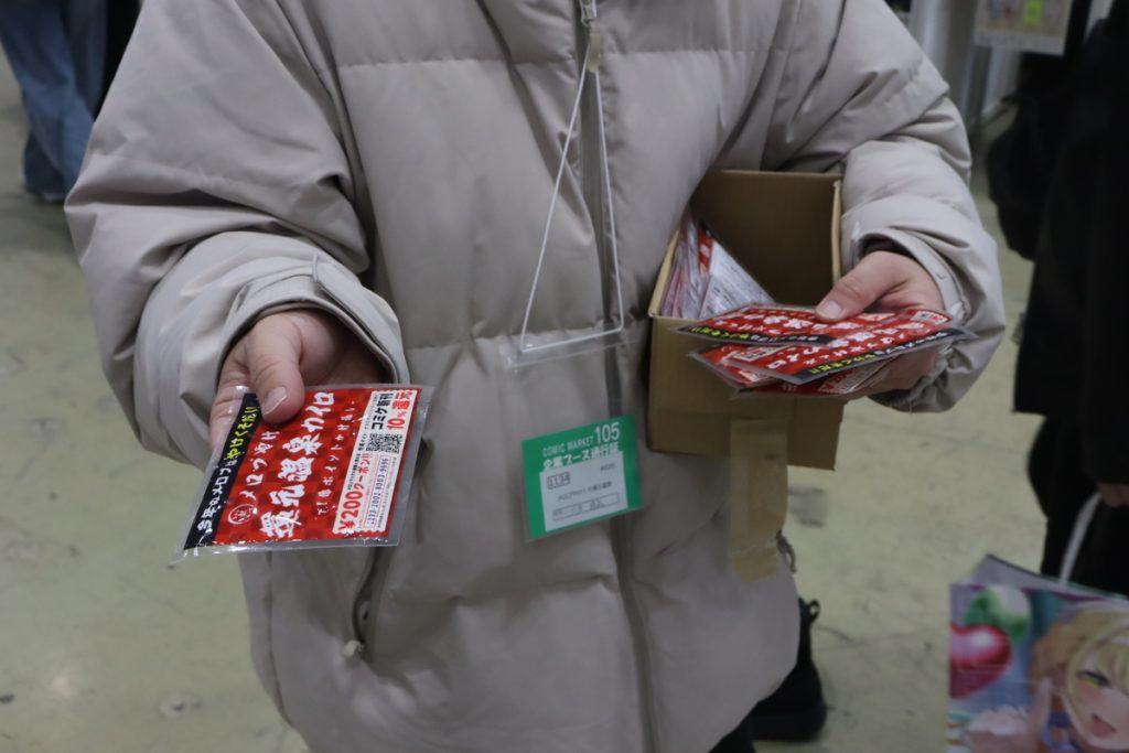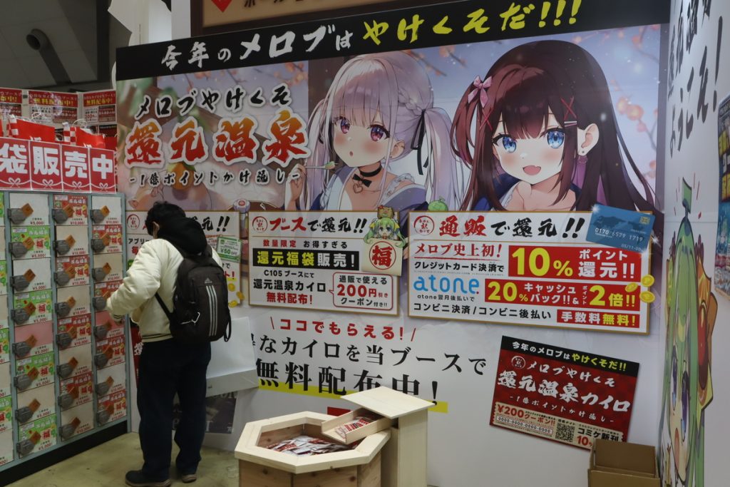 コミケ期間中、会場で同人誌の委託販売受付を行うメロンブックス。冬のコミケを暖かく乗り切るべく、インスタントカイロを無料で配布していた。
