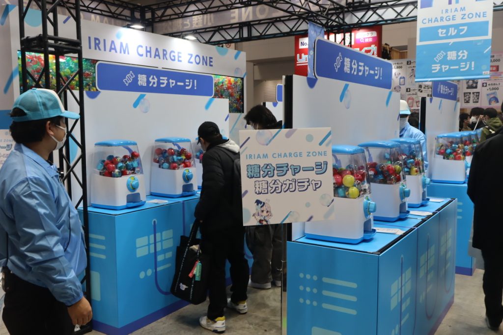Vtuberアプリ「IRIAM」は、「糖分、小銭を充電」をテーマに、無料で楽しめるお菓子キャッチャーのほか、両替機、モバイル端末の充電器などを用意。来場者をサポートした。
