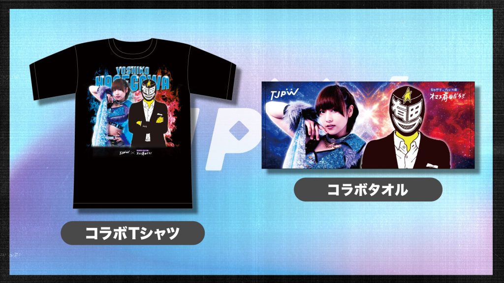 長谷川)コラボグッズも出ることになり、レスラーとのコラボグッズも多分初だと思うんです。Tシャツとタオル、私と有田さんのキャラクターが並んでるものが販売されるので、記念にぜひお買い求めください!