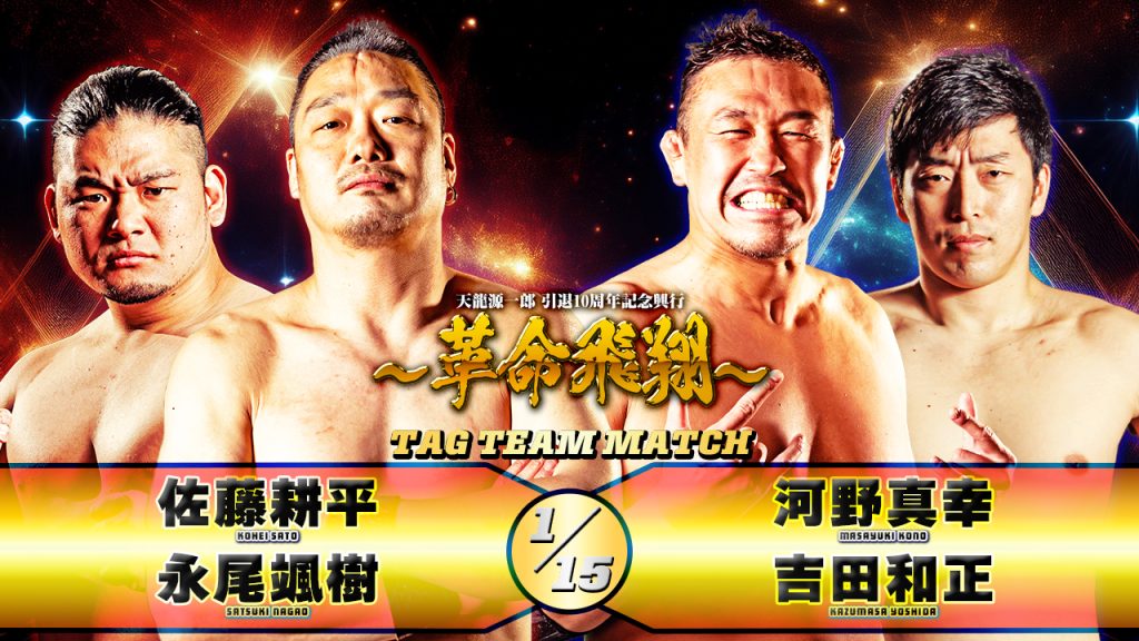 2015.11.15天龍引退時、当初はKAIENTAI-DOJOの真霜拳號、火野裕士の二名がそれぞれ諏訪間、藤田和之のパートナーとして名を連ねていたが、火野のKAIENTAI-DOJO退団により出場不可となり、大日本プロレスより関本・岡林が急遽出場となった経緯がある。今回はその逆で、関本大介の欠場により、旧KAIENTAI-DOJO、現2AWの真霜拳號がピンチを救う形で出場。