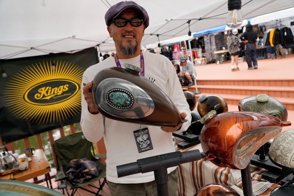 チャペル前の広場でお話したキングスカスタムペイントさん。左下のタンク、真鍮のプレート貼ってるのかと思いきや、全部塗装で金属感を出してるそう。つまり全部のタンクがペイントで質感を表現しているという衝撃!