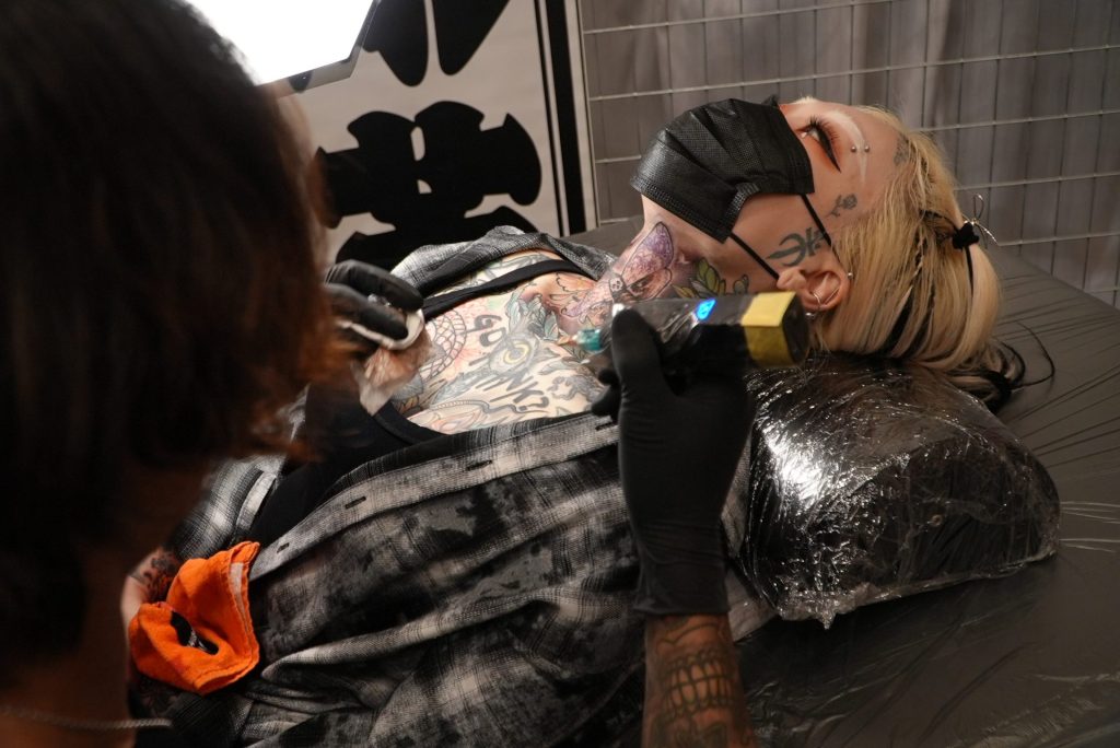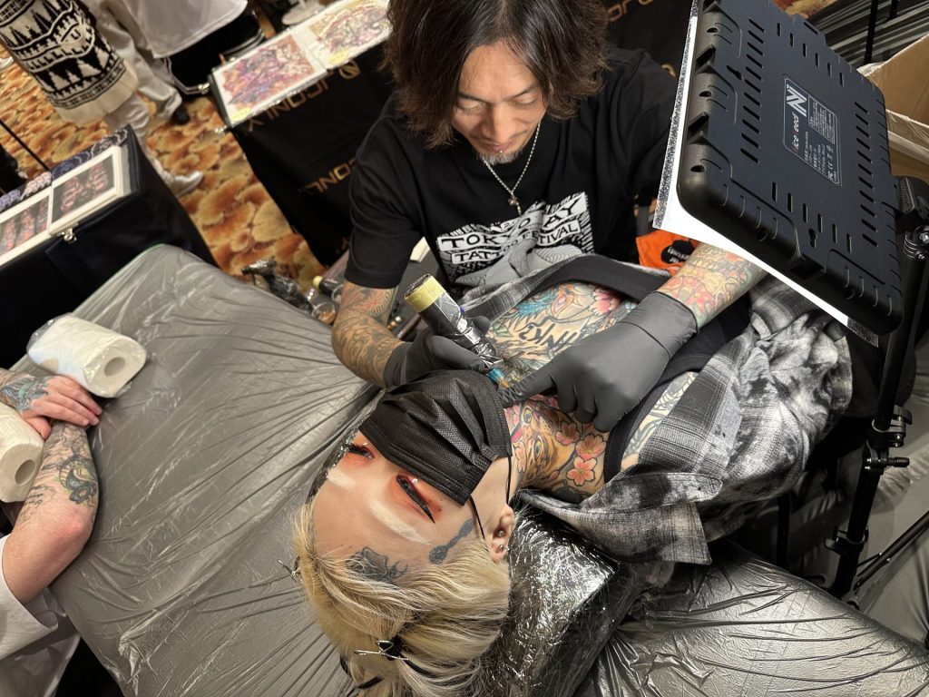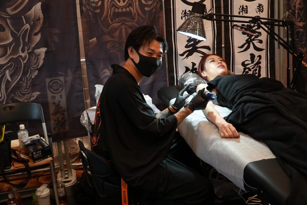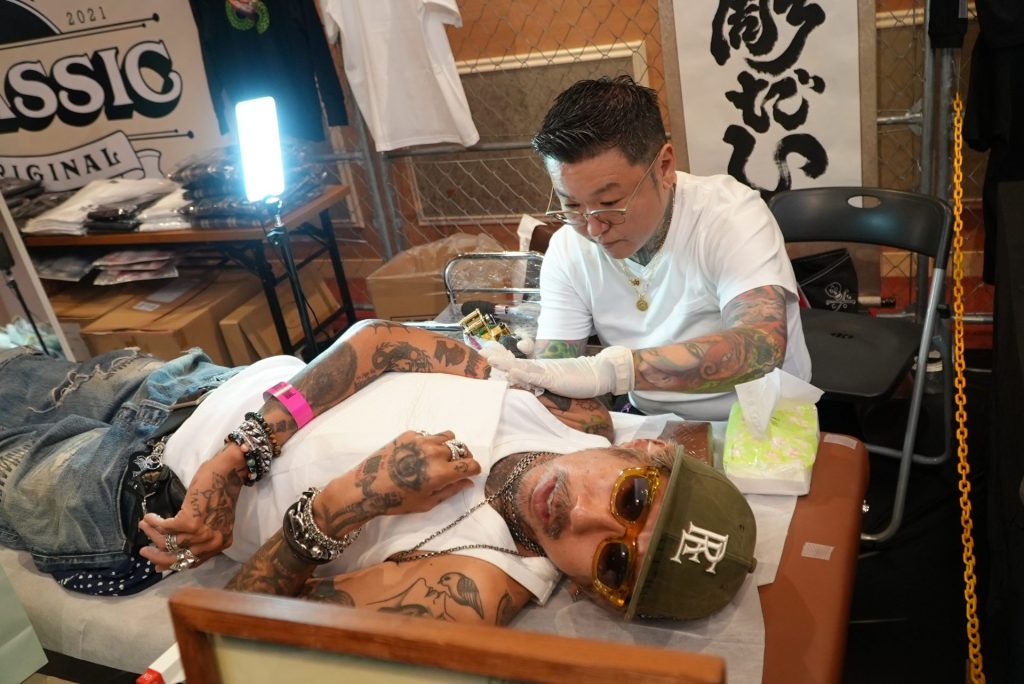 事前対談でも登場していただいた村田-おとん-ヤスシさんから「彫だいさんのブースで新しいタトゥー入れます」と聞いてたもので、早速行ってみました。