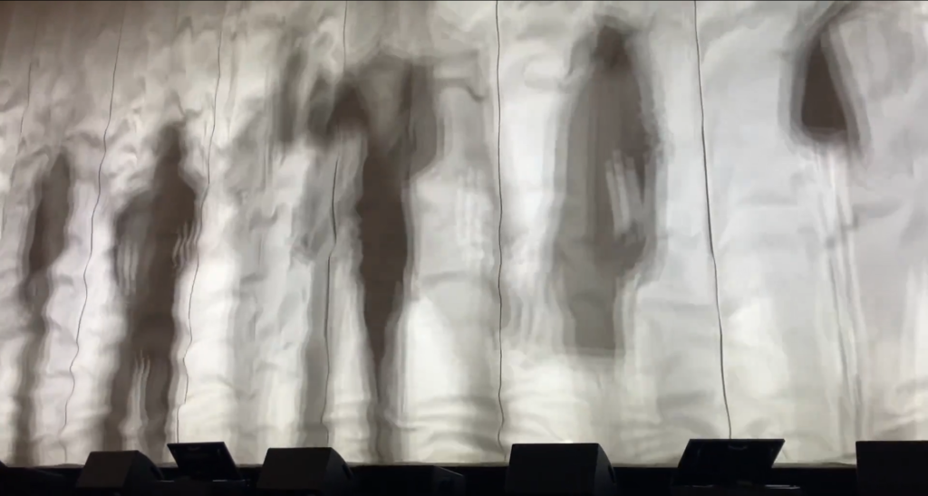 今年は例年のように1名ずつ呼び込む形式ではなく、巨大なバックドロップの裏側に、ゲスト全員が待機している影が映し出されるという演出。