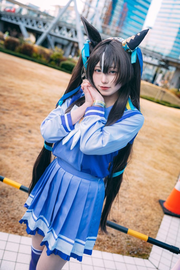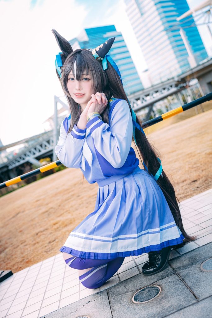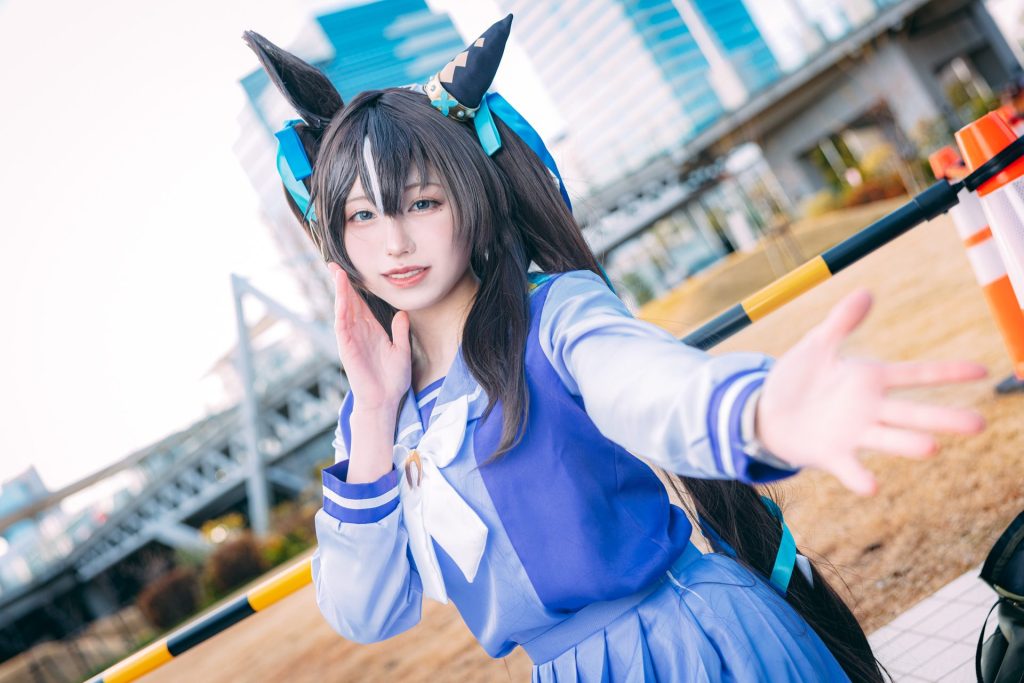 セレブを夢見るウマ娘・ヴィブロスのコスを披露してくれたのは、ちょおゆーさん。特徴的な髪型を再現するウィッグが、一押しポイントだそうだ。