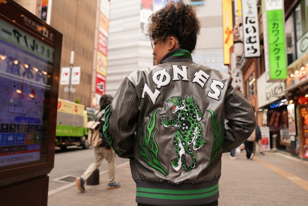 ZONES)このスタジャンの原案をもらったんです。他にも浮世絵キーホルダーの原案とか。日本で制作を進めるので、HIROCKさんっていう有名なデザイナーさんに相談したら「俺がやってあげるよ」って言ってくれて。デザインを付け足して中国のアパレル工場で職人さん達が10人とかでちくちくこう縫ってくれたらしいです。いろんな人の助けを借りながら完成しました。