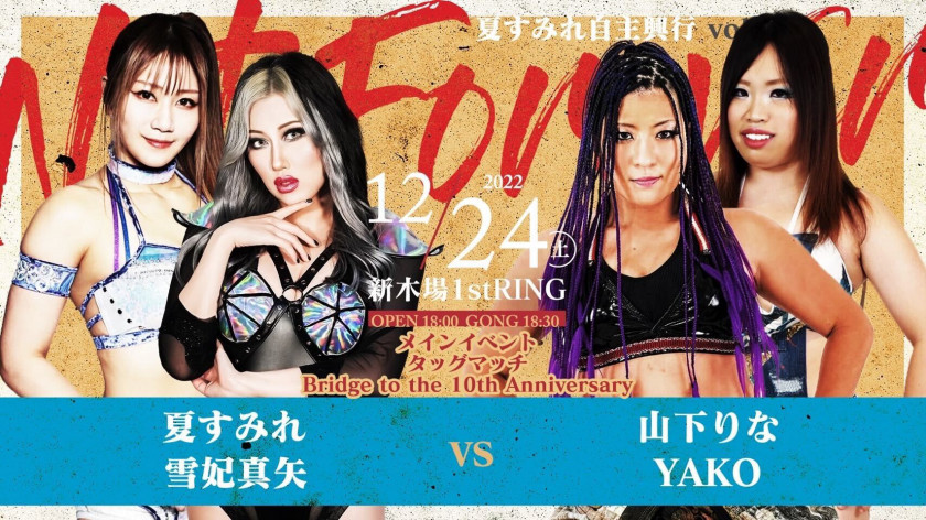 夏)あ、イブにぶつけたのは、ただ会場が空いてたから…ってだけなんですよ(笑)この日の昼間は興行戦争なんですね。でも、不思議なくらい夜だけ空いてたんですよ。だからラッキーと思って会場を押さえたけど、知り合いの方々から「12/24はさすがに行けないよ」って言われて、なぜ夜だけ空いていたのか理由が分かりました…。ひょっとしたら各団体さんからは「ああ、夏が魔のクリスマスイブの夜に特攻しちゃったよ」って思われてるかも(笑)