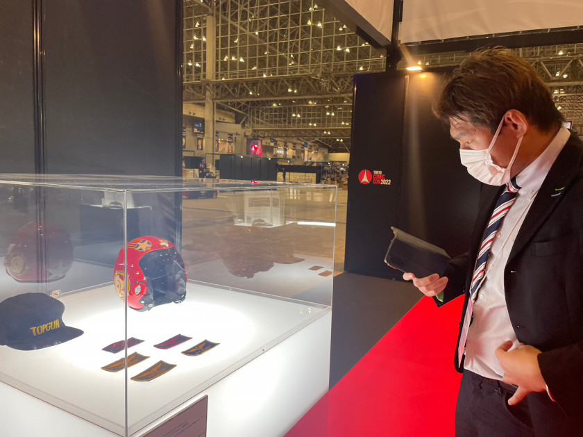貴重な『トップガン』のパイロットヘルメットを見つめる岡田選手